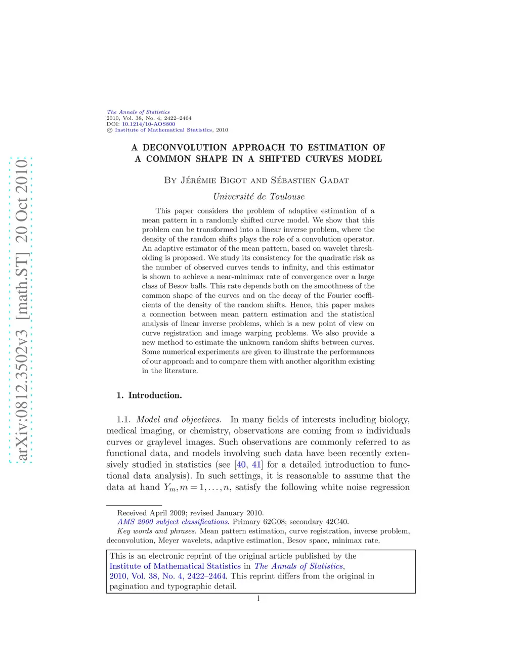 This paper considers the problem of adaptive estimation of a mean pattern in a randomly shifted curve model. We show that this problem can be transformed into a linear inverse problem, where the density of the random shifts plays the role of a convolution operator. An adaptive estimator of the mean pattern, based on wavelet thresholding is proposed. We study its consistency for the quadratic risk as the number of observed curves tends to infinity, and this estimator is shown to achieve a near-minimax rate of convergence over a large class of Besov balls. This rate depends both on the smoothness of the common shape of the curves and on the decay of the Fourier coefficients of the density of the random shifts. Hence, this paper makes a connection between mean pattern estimation and the statistical analysis of linear inverse problems, which is a new point of view on curve registration and image warping problems. We also provide a new method to estimate the unknown random shifts between curves. Some numerical experiments are given to illustrate the performances of our approach and to compare them with another algorithm existing in the literature.