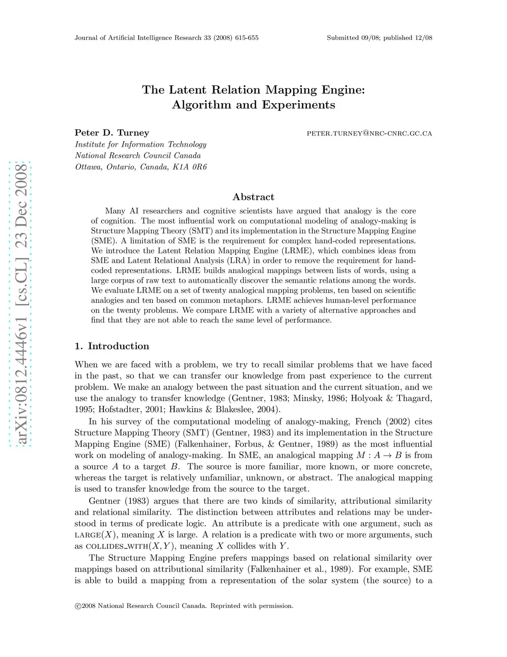Many AI researchers and cognitive scientists have argued that analogy is the core of cognition. The most influential work on computational modeling of analogy-making is Structure Mapping Theory (SMT) and its implementation in the Structure Mapping Engine (SME). A limitation of SME is the requirement for complex hand-coded representations. We introduce the Latent Relation Mapping Engine (LRME), which combines ideas from SME and Latent Relational Analysis (LRA) in order to remove the requirement for hand-coded representations. LRME builds analogical mappings between lists of words, using a large corpus of raw text to automatically discover the semantic relations among the words. We evaluate LRME on a set of twenty analogical mapping problems, ten based on scientific analogies and ten based on common metaphors. LRME achieves human-level performance on the twenty problems. We compare LRME with a variety of alternative approaches and find that they are not able to reach the same level of performance.