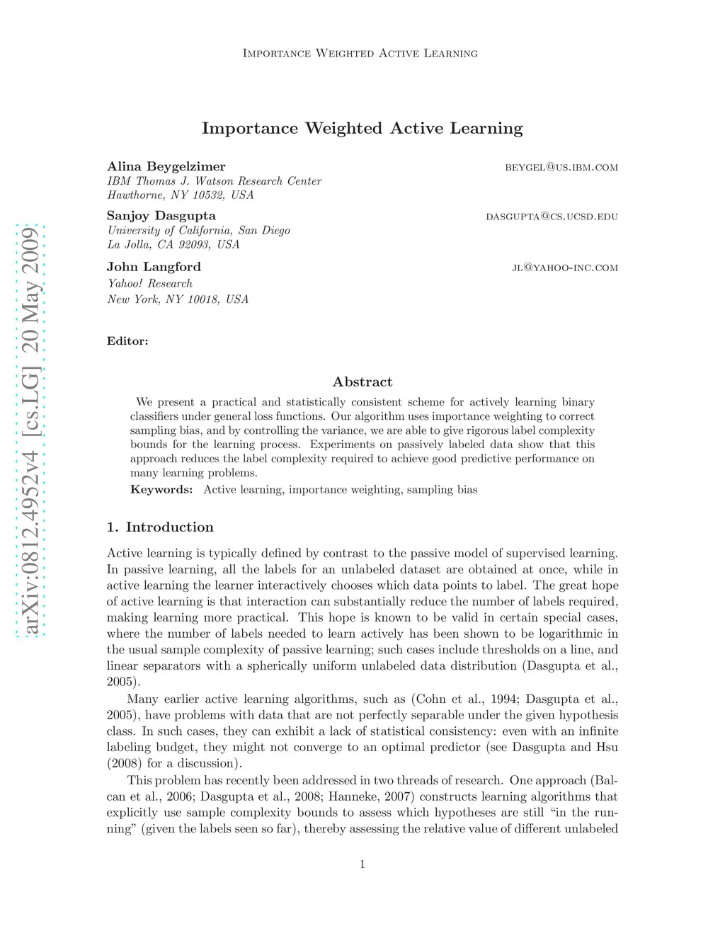 We present a practical and statistically consistent scheme for actively learning binary classifiers under general loss functions. Our algorithm uses importance weighting to correct sampling bias, and by controlling the variance, we are able to give rigorous label complexity bounds for the learning process. Experiments on passively labeled data show that this approach reduces the label complexity required to achieve good predictive performance on many learning problems.