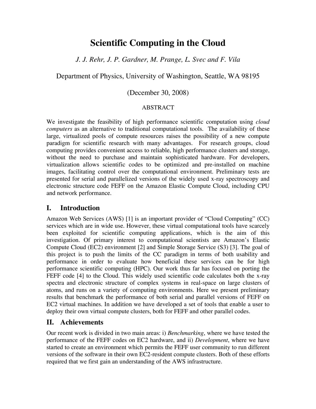 We investigate the feasibility of high performance scientific computation using cloud computers as an alternative to traditional computational tools. The availability of these large, virtualized pools of compute resources raises the possibility of a new compute paradigm for scientific research with many advantages. For research groups, cloud computing provides convenient access to reliable, high performance clusters and storage, without the need to purchase and maintain sophisticated hardware. For developers, virtualization allows scientific codes to be optimized and pre-installed on machine images, facilitating control over the computational environment. Preliminary tests are presented for serial and parallelized versions of the widely used x-ray spectroscopy and electronic structure code FEFF on the Amazon Elastic Compute Cloud, including CPU and network performance.