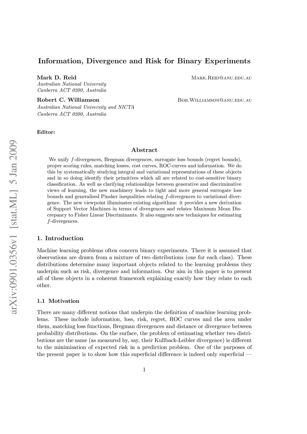 We unify f-divergences, Bregman divergences, surrogate loss bounds (regret bounds), proper scoring rules, matching losses, cost curves, ROC-curves and information. We do this by systematically studying integral and variational representations of these objects and in so doing identify their primitives which all are related to cost-sensitive binary classification. As well as clarifying relationships between generative and discriminative views of learning, the new machinery leads to tight and more general surrogate loss bounds and generalised Pinsker inequalities relating f-divergences to variational divergence. The new viewpoint illuminates existing algorithms: it provides a new derivation of Support Vector Machines in terms of divergences and relates Maximum Mean Discrepancy to Fisher Linear Discriminants. It also suggests new techniques for estimating f-divergences.