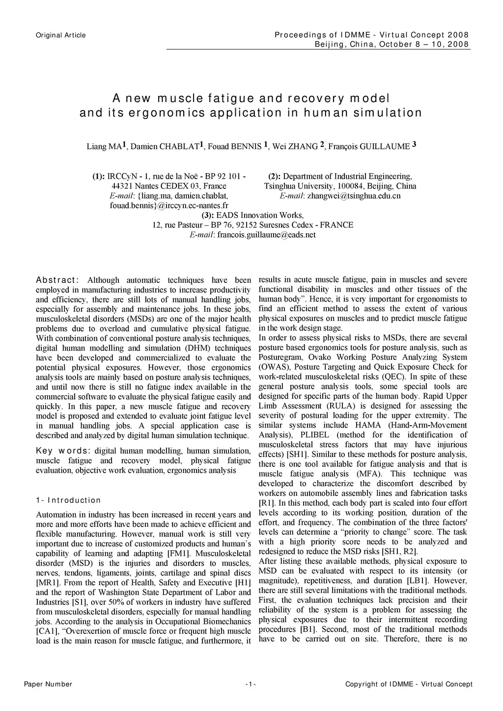 Although automatic techniques have been employed in manufacturing industries to increase productivity and efficiency, there are still lots of manual handling jobs, especially for assembly and maintenance jobs. In these jobs, musculoskeletal disorders (MSDs) are one of the major health problems due to overload and cumulative physical fatigue. With combination of conventional posture analysis techniques, digital human modelling and simulation (DHM) techniques have been developed and commercialized to evaluate the potential physical exposures. However, those ergonomics analysis tools are mainly based on posture analysis techniques, and until now there is still no fatigue index available in the commercial software to evaluate the physical fatigue easily and quickly. In this paper, a new muscle fatigue and recovery model is proposed and extended to evaluate joint fatigue level in manual handling jobs. A special application case is described and analyzed by digital human simulation technique.