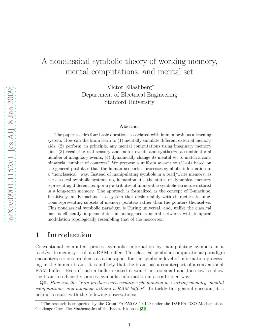 The paper tackles four basic questions associated with human brain as a learning system. How can the brain learn to (1) mentally simulate different external memory aids, (2) perform, in principle, any mental computations using imaginary memory aids, (3) recall the real sensory and motor events and synthesize a combinatorial number of imaginary events, (4) dynamically change its mental set to match a combinatorial number of contexts? We propose a uniform answer to (1)-(4) based on the general postulate that the human neocortex processes symbolic information in a "nonclassical" way. Instead of manipulating symbols in a read/write memory, as the classical symbolic systems do, it manipulates the states of dynamical memory representing different temporary attributes of immovable symbolic structures stored in a long-term memory. The approach is formalized as the concept of E-machine. Intuitively, an E-machine is a system that deals mainly with characteristic functions representing subsets of memory pointers rather than the pointers themselves. This nonclassical symbolic paradigm is Turing universal, and, unlike the classical one, is efficiently implementable in homogeneous neural networks with temporal modulation topologically resembling that of the neocortex.