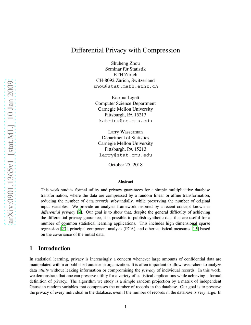 This work studies formal utility and privacy guarantees for a simple multiplicative database transformation, where the data are compressed by a random linear or affine transformation, reducing the number of data records substantially, while preserving the number of original input variables. We provide an analysis framework inspired by a recent concept known as differential privacy (Dwork 06). Our goal is to show that, despite the general difficulty of achieving the differential privacy guarantee, it is possible to publish synthetic data that are useful for a number of common statistical learning applications. This includes high dimensional sparse regression (Zhou et al. 07), principal component analysis (PCA), and other statistical measures (Liu et al. 06) based on the covariance of the initial data.