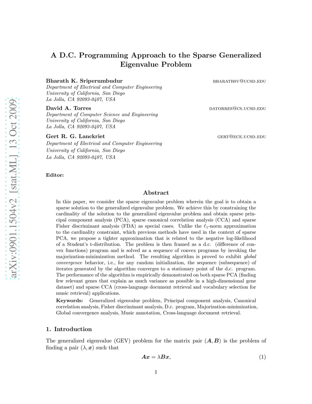 In this paper, we consider the sparse eigenvalue problem wherein the goal is to obtain a sparse solution to the generalized eigenvalue problem. We achieve this by constraining the cardinality of the solution to the generalized eigenvalue problem and obtain sparse principal component analysis (PCA), sparse canonical correlation analysis (CCA) and sparse Fisher discriminant analysis (FDA) as special cases. Unlike the -norm approximation to the cardinality constraint, which previous methods have used in the context of sparse PCA, we propose a tighter approximation that is related to the negative log-likelihood of a Student's t-distribution. The problem is then framed as a d.c. (difference of convex functions) program and is solved as a sequence of convex programs by invoking the majorization-minimization method. The resulting algorithm is proved to exhibit \emph{global convergence} behavior, i.e., for any random initialization, the sequence (subsequence) of iterates generated by the algorithm converges to a stationary point of the d.c. program. The performance of the algorithm is empirically demonstrated on both sparse PCA (finding few relevant genes that explain as much variance as possible in a high-dimensional gene dataset) and sparse CCA (cross-language document retrieval and vocabulary selection for music retrieval) applications.