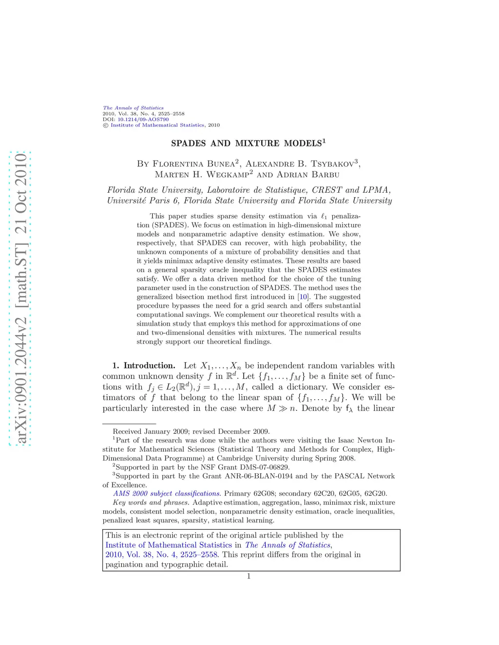 This paper studies sparse density estimation via penalization (SPADES). We focus on estimation in high-dimensional mixture models and nonparametric adaptive density estimation. We show, respectively, that SPADES can recover, with high probability, the unknown components of a mixture of probability densities and that it yields minimax adaptive density estimates. These results are based on a general sparsity oracle inequality that the SPADES estimates satisfy. We offer a data driven method for the choice of the tuning parameter used in the construction of SPADES. The method uses the generalized bisection method first introduced in \citebb09. The suggested procedure bypasses the need for a grid search and offers substantial computational savings. We complement our theoretical results with a simulation study that employs this method for approximations of one and two-dimensional densities with mixtures. The numerical results strongly support our theoretical findings.