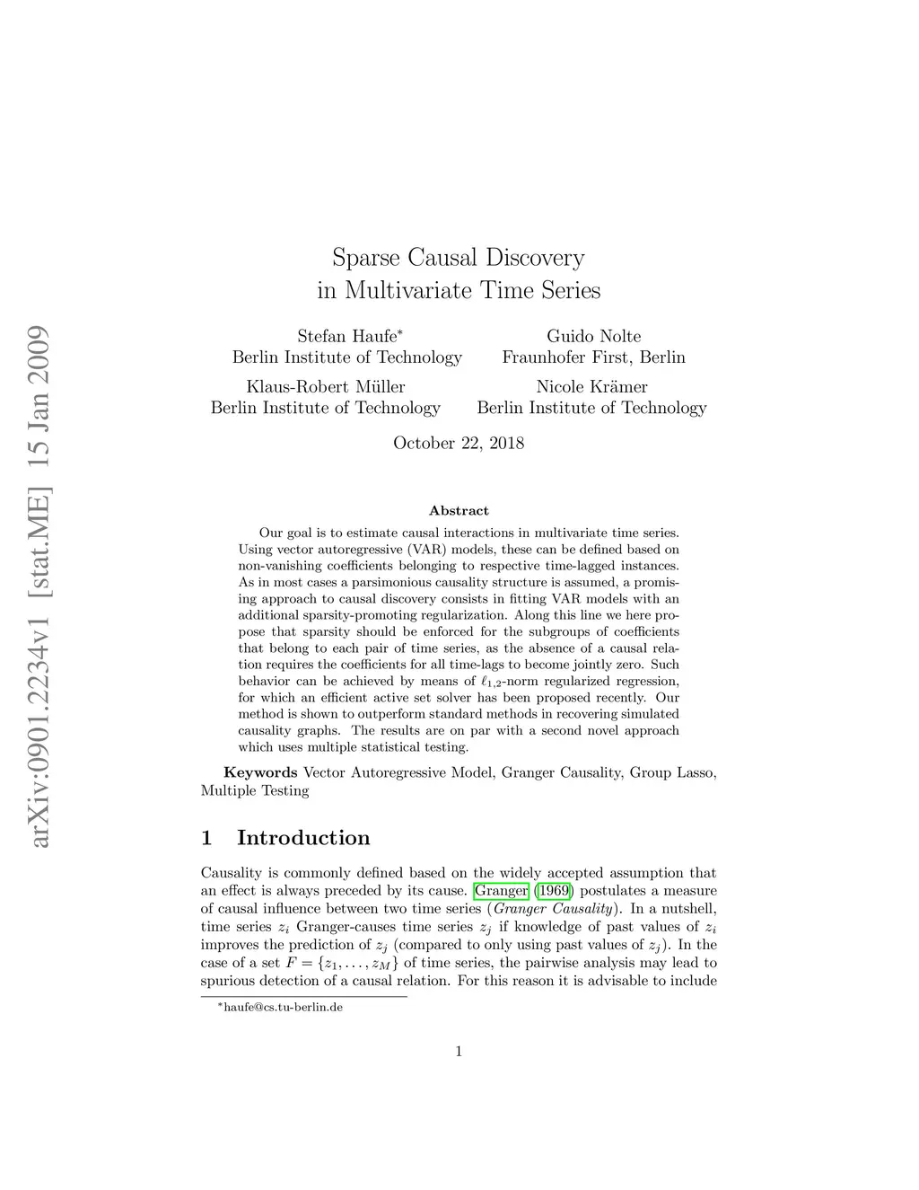 Our goal is to estimate causal interactions in multivariate time series. Using vector autoregressive (VAR) models, these can be defined based on non-vanishing coefficients belonging to respective time-lagged instances. As in most cases a parsimonious causality structure is assumed, a promising approach to causal discovery consists in fitting VAR models with an additional sparsity-promoting regularization. Along this line we here propose that sparsity should be enforced for the subgroups of coefficients that belong to each pair of time series, as the absence of a causal relation requires the coefficients for all time-lags to become jointly zero. Such behavior can be achieved by means of l1-l2-norm regularized regression, for which an efficient active set solver has been proposed recently. Our method is shown to outperform standard methods in recovering simulated causality graphs. The results are on par with a second novel approach which uses multiple statistical testing.