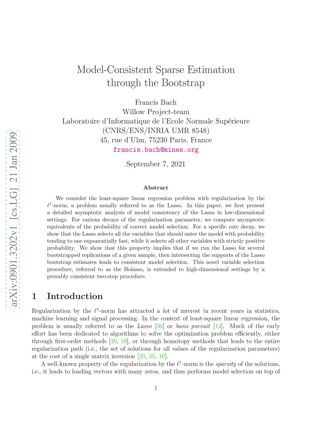 We consider the least-square linear regression problem with regularization by the -norm, a problem usually referred to as the Lasso. In this paper, we first present a detailed asymptotic analysis of model consistency of the Lasso in low-dimensional settings. For various decays of the regularization parameter, we compute asymptotic equivalents of the probability of correct model selection. For a specific rate decay, we show that the Lasso selects all the variables that should enter the model with probability tending to one exponentially fast, while it selects all other variables with strictly positive probability. We show that this property implies that if we run the Lasso for several bootstrapped replications of a given sample, then intersecting the supports of the Lasso bootstrap estimates leads to consistent model selection. This novel variable selection procedure, referred to as the Bolasso, is extended to high-dimensional settings by a provably consistent two-step procedure.