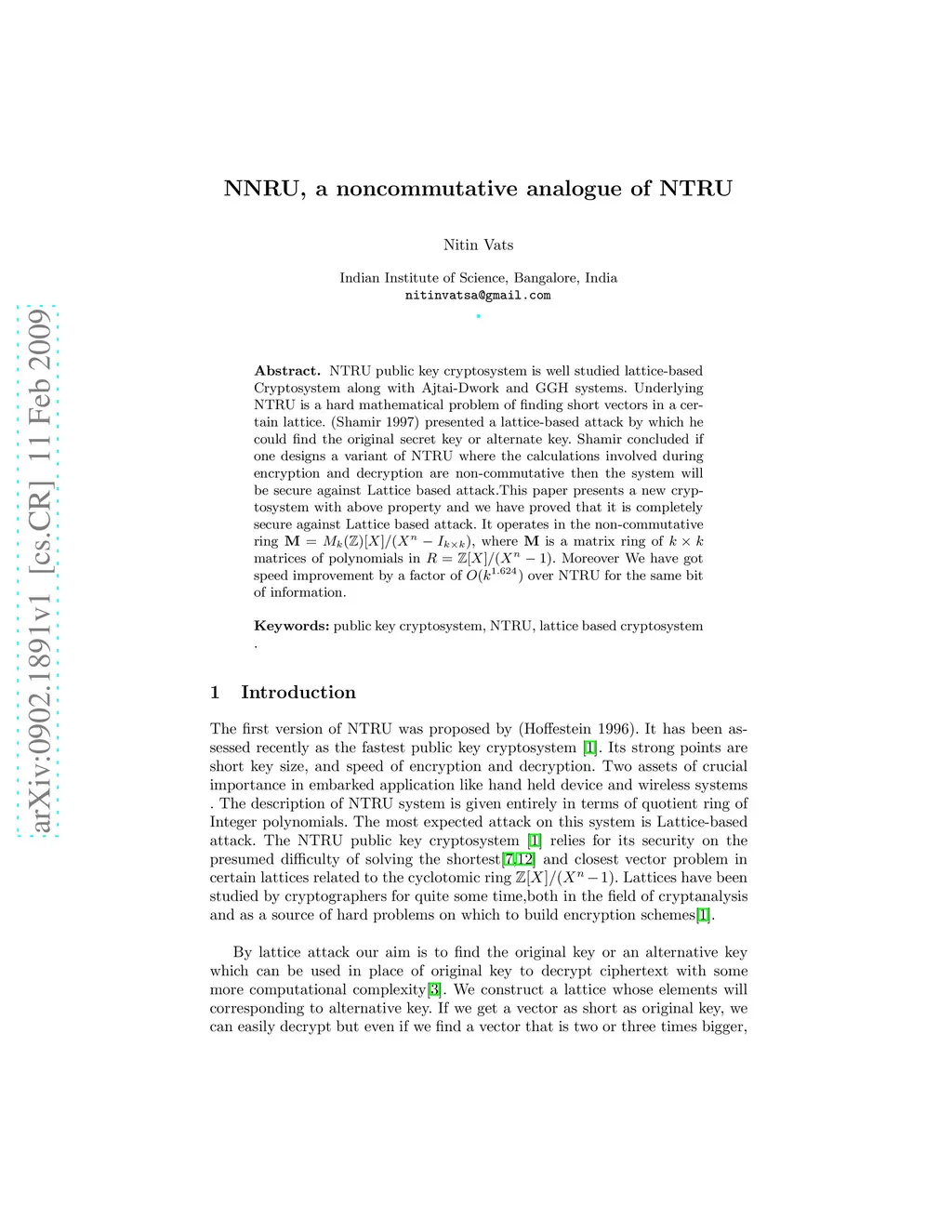 NTRU public key cryptosystem is well studied lattice-based Cryptosystem along with Ajtai-Dwork and GGH systems. Underlying NTRU is a hard mathematical problem of finding short vectors in a certain lattice. (Shamir 1997) presented a lattice-based attack by which he could find the original secret key or alternate key. Shamir concluded if one designs a variant of NTRU where the calculations involved during encryption and decryption are non-commutative then the system will be secure against Lattice based attack.This paper presents a new cryptosystem with above property and we have proved that it is completely secure against Lattice based attack. It operates in the non-commutative ring M=M_k Z[X]/(X^n - I_{k*k}, where M is a matrix ring of k*k matrices of polynomials in R={Z}[X]/(X^n-1). Moreover We have got speed improvement by a factor of O(k^{1.624) over NTRU for the same bit of information.