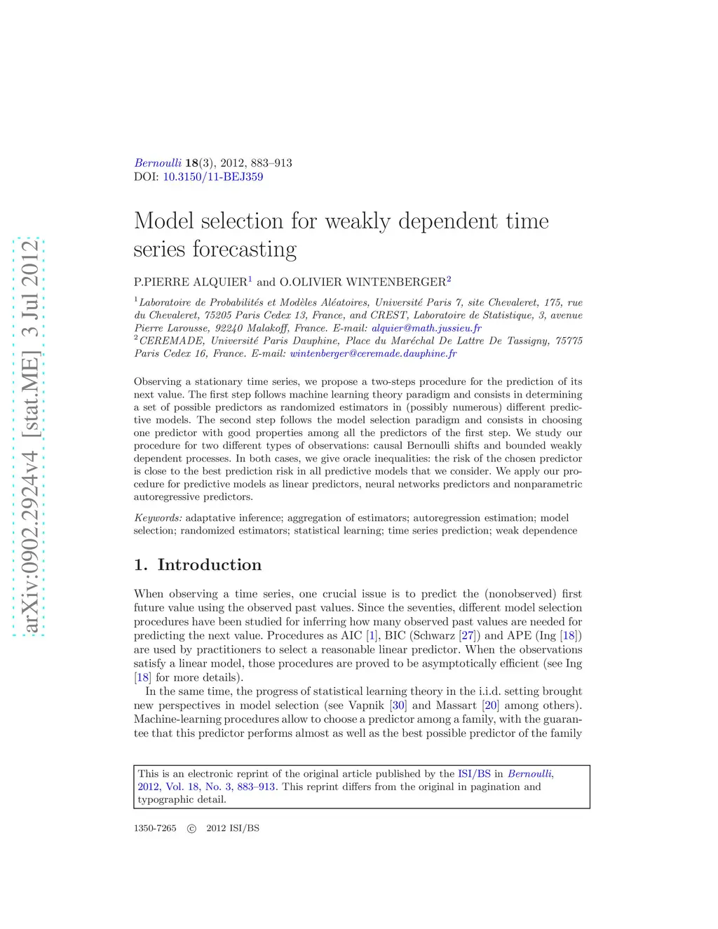Observing a stationary time series, we propose a two-step procedure for the prediction of the next value of the time series. The first step follows machine learning theory paradigm and consists in determining a set of possible predictors as randomized estimators in (possibly numerous) different predictive models. The second step follows the model selection paradigm and consists in choosing one predictor with good properties among all the predictors of the first steps. We study our procedure for two different types of bservations: causal Bernoulli shifts and bounded weakly dependent processes. In both cases, we give oracle inequalities: the risk of the chosen predictor is close to the best prediction risk in all predictive models that we consider. We apply our procedure for predictive models such as linear predictors, neural networks predictors and non-parametric autoregressive.