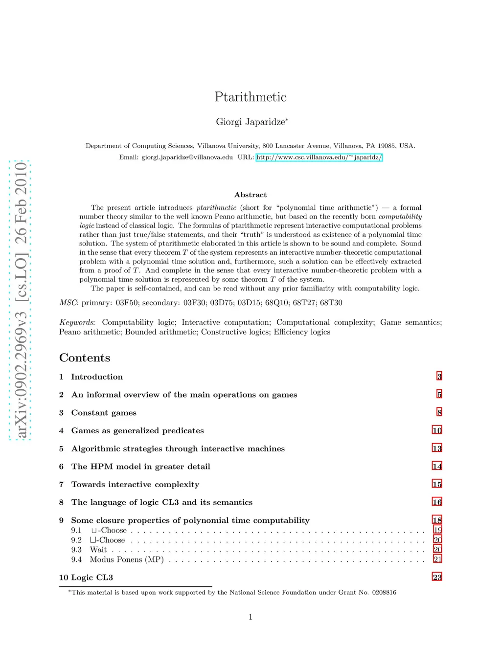 The present article introduces ptarithmetic (short for "polynomial time arithmetic") -- a formal number theory similar to the well known Peano arithmetic, but based on the recently born computability logic (see http://www.cis.upenn.edu/~giorgi/cl.html) instead of classical logic. The formulas of ptarithmetic represent interactive computational problems rather than just true/false statements, and their "truth" is understood as existence of a polynomial time solution. The system of ptarithmetic elaborated in this article is shown to be sound and complete. Sound in the sense that every theorem T of the system represents an interactive number-theoretic computational problem with a polynomial time solution and, furthermore, such a solution can be effectively extracted from a proof of T. And complete in the sense that every interactive number-theoretic problem with a polynomial time solution is represented by some theorem T of the system. The paper is self-contained, and can be read without any previous familiarity with computability logic.