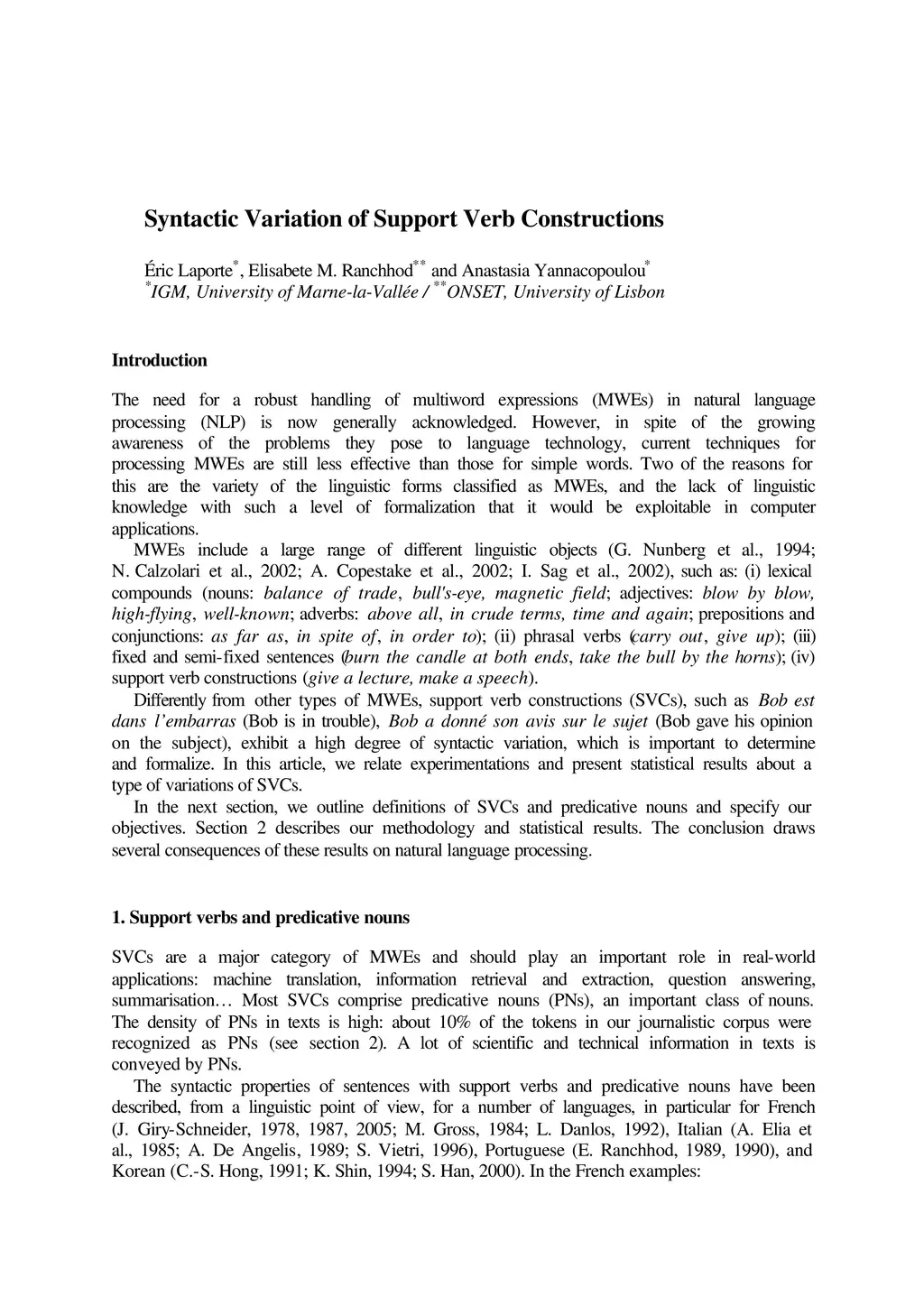 We report experiments about the syntactic variations of support verb constructions, a special type of multiword expressions (MWEs) containing predicative nouns. In these expressions, the noun can occur with or without the verb, with no clear-cut semantic difference. We extracted from a large French corpus a set of examples of the two situations and derived statistical results from these data. The extraction involved large-coverage language resources and finite-state techniques. The results show that, most frequently, predicative nouns occur without a support verb. This fact has consequences on methods of extracting or recognising MWEs.