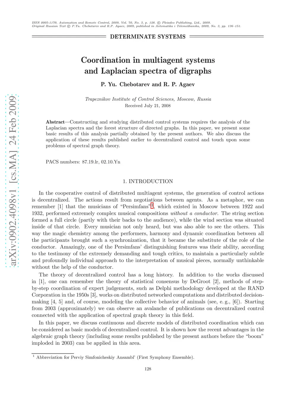 Coordination in multiagent systems and Laplacian spectra of digraphs