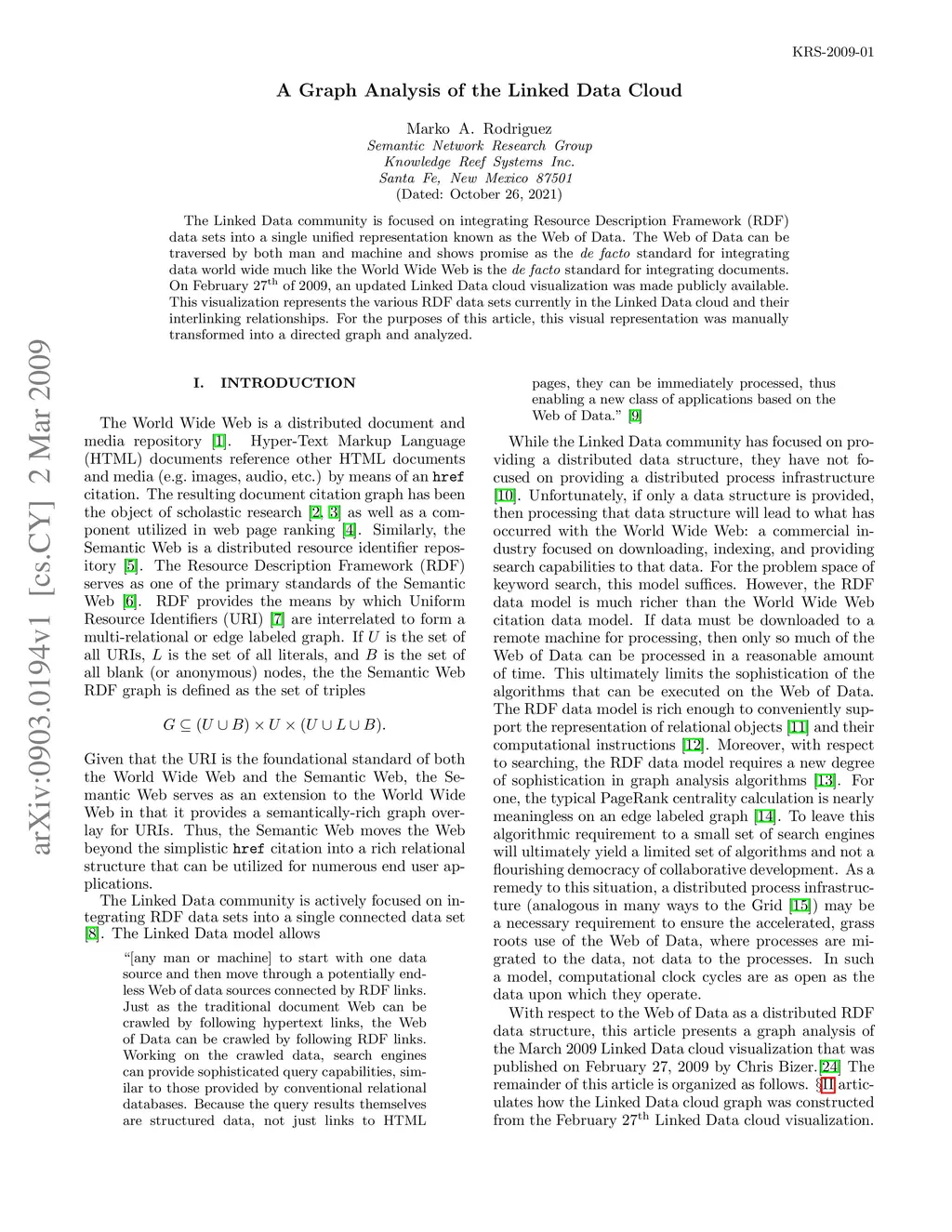 The Linked Data community is focused on integrating Resource Description Framework (RDF) data sets into a single unified representation known as the Web of Data. The Web of Data can be traversed by both man and machine and shows promise as the \textit{de facto} standard for integrating data world wide much like the World Wide Web is the \textit{de facto} standard for integrating documents. On February 27 of 2009, an updated Linked Data cloud visualization was made publicly available. This visualization represents the various RDF data sets currently in the Linked Data cloud and their interlinking relationships. For the purposes of this article, this visual representation was manually transformed into a directed graph and analyzed.