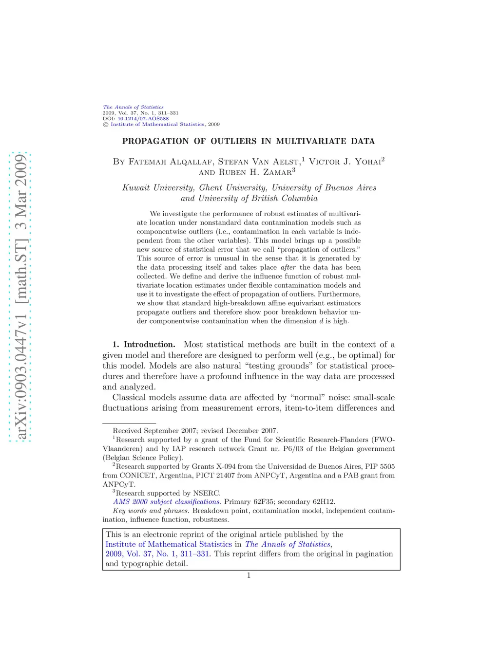 Propagation of outliers in multivariate data