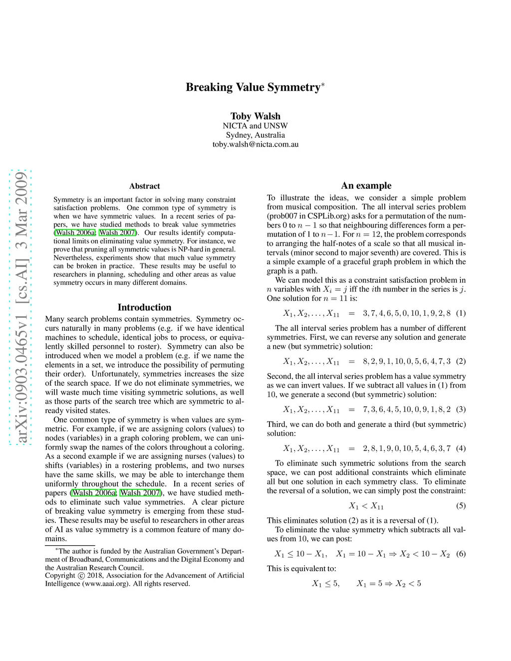 Symmetry is an important factor in solving many constraint satisfaction problems. One common type of symmetry is when we have symmetric values. In a recent series of papers, we have studied methods to break value symmetries. Our results identify computational limits on eliminating value symmetry. For instance, we prove that pruning all symmetric values is NP-hard in general. Nevertheless, experiments show that much value symmetry can be broken in practice. These results may be useful to researchers in planning, scheduling and other areas as value symmetry occurs in many different domains.