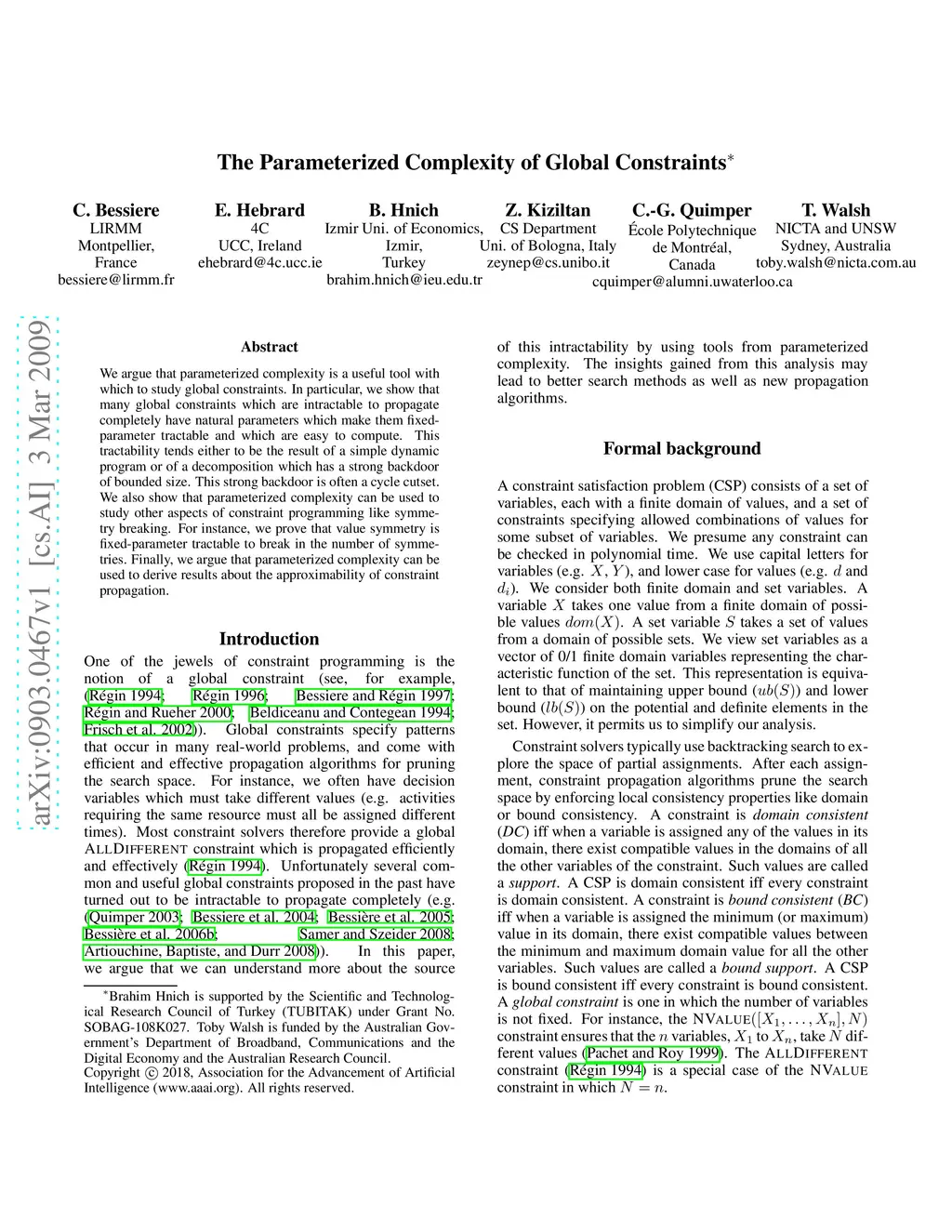 We argue that parameterized complexity is a useful tool with which to study global constraints. In particular, we show that many global constraints which are intractable to propagate completely have natural parameters which make them fixed-parameter tractable and which are easy to compute. This tractability tends either to be the result of a simple dynamic program or of a decomposition which has a strong backdoor of bounded size. This strong backdoor is often a cycle cutset. We also show that parameterized complexity can be used to study other aspects of constraint programming like symmetry breaking. For instance, we prove that value symmetry is fixed-parameter tractable to break in the number of symmetries. Finally, we argue that parameterized complexity can be used to derive results about the approximability of constraint propagation.