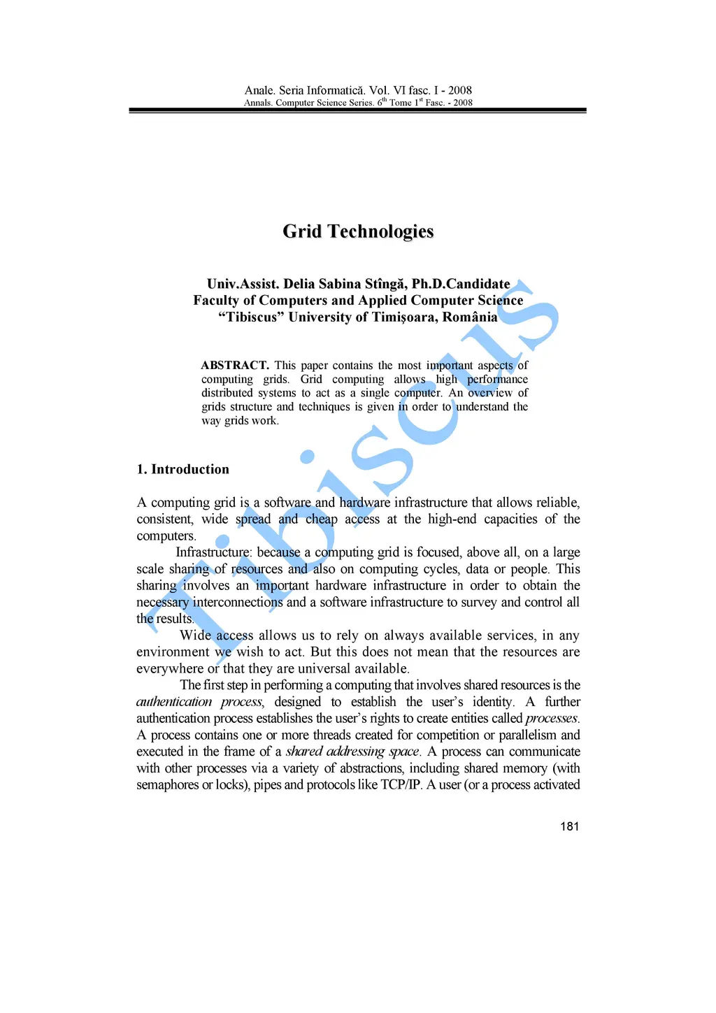 This paper contains the most important aspects of computing grids. Grid computing allows high performance distributed systems to act as a single computer. An overview of grids structure and techniques is given in order to understand the way grids work.