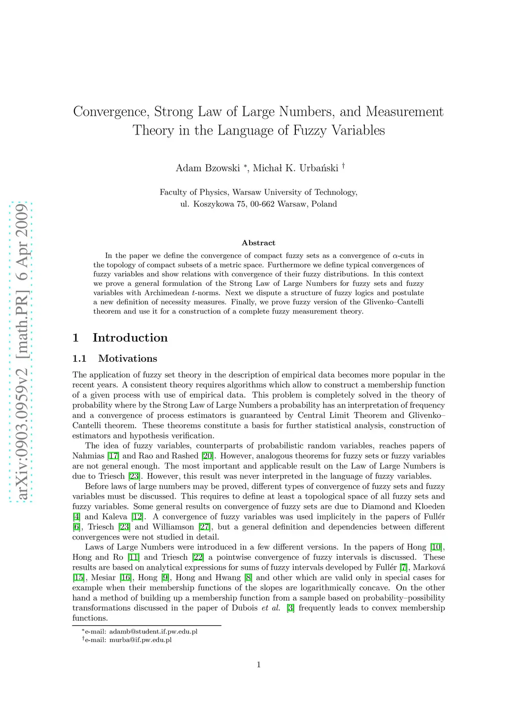 In the paper we define the convergence of compact fuzzy sets as a convergence of alpha-cuts in the topology of compact subsets of a metric space. Furthermore we define typical convergences of fuzzy variables and show relations with convergence of their fuzzy distributions. In this context we prove a general formulation of the Strong Law of Large Numbers for fuzzy sets and fuzzy variables with Archimedean t-norms. Next we dispute a structure of fuzzy logics and postulate a new definition of necessity measures. Finally, we prove fuzzy version of the Glivenko-Cantelli theorem and use it for a construction of a complete fuzzy measure theory.