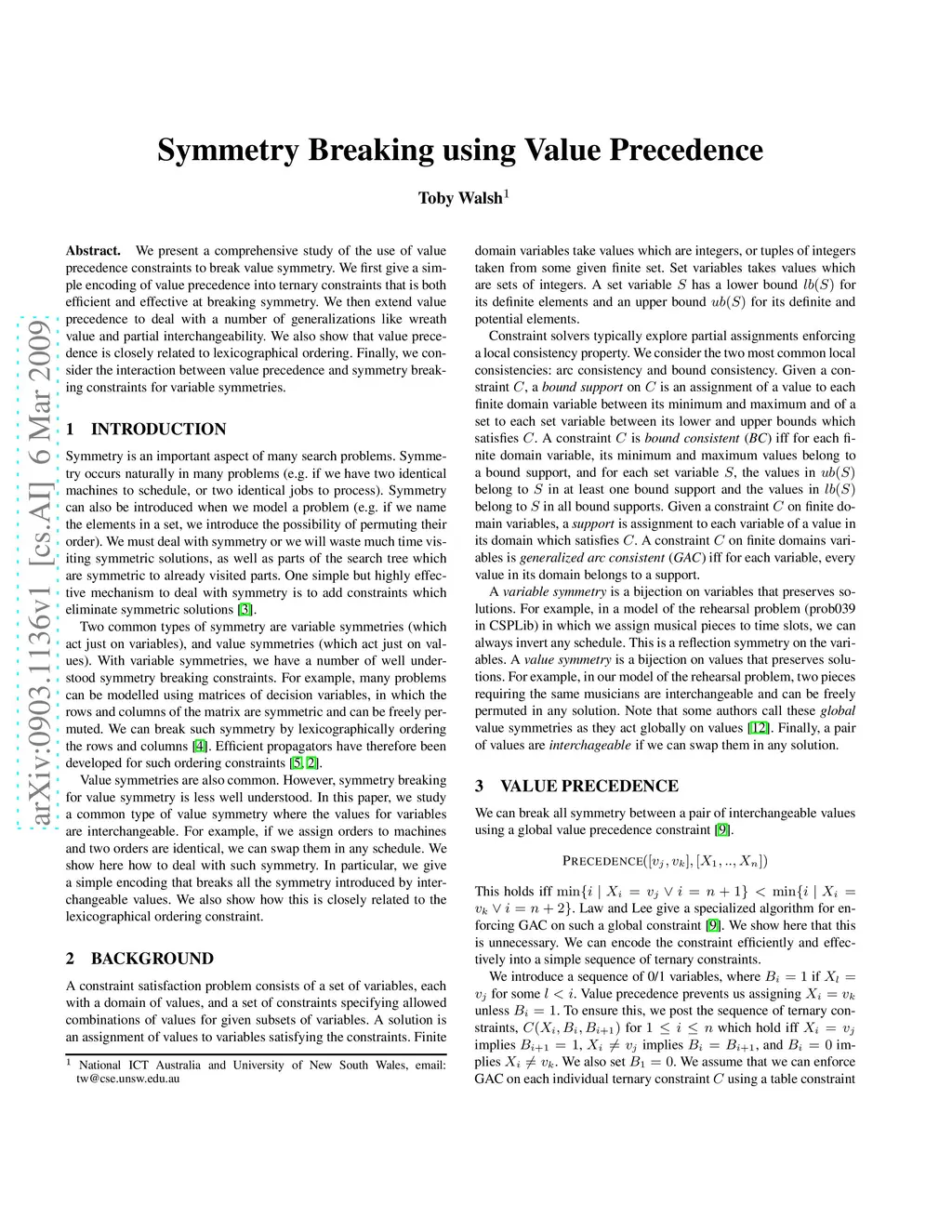 Symmetry Breaking Using Value Precedence