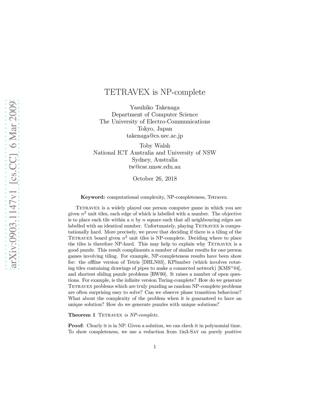 Tetravex is a widely played one person computer game in which you are given unit tiles, each edge of which is labelled with a number. The objective is to place each tile within a by square such that all neighbouring edges are labelled with an identical number. Unfortunately, playing Tetravex is computationally hard. More precisely, we prove that deciding if there is a tiling of the Tetravex board is NP-complete. Deciding where to place the tiles is therefore NP-hard. This may help to explain why Tetravex is a good puzzle. This result compliments a number of similar results for one person games involving tiling. For example, NP-completeness results have been shown for: the offline version of Tetris, KPlumber (which involves rotating tiles containing drawings of pipes to make a connected network), and shortest sliding puzzle problems. It raises a number of open questions. For example, is the infinite version Turing-complete? How do we generate Tetravex problems which are truly puzzling as random NP-complete problems are often surprising easy to solve? Can we observe phase transition behaviour? What about the complexity of the problem when it is guaranteed to have an unique solution? How do we generate puzzles with unique solutions?