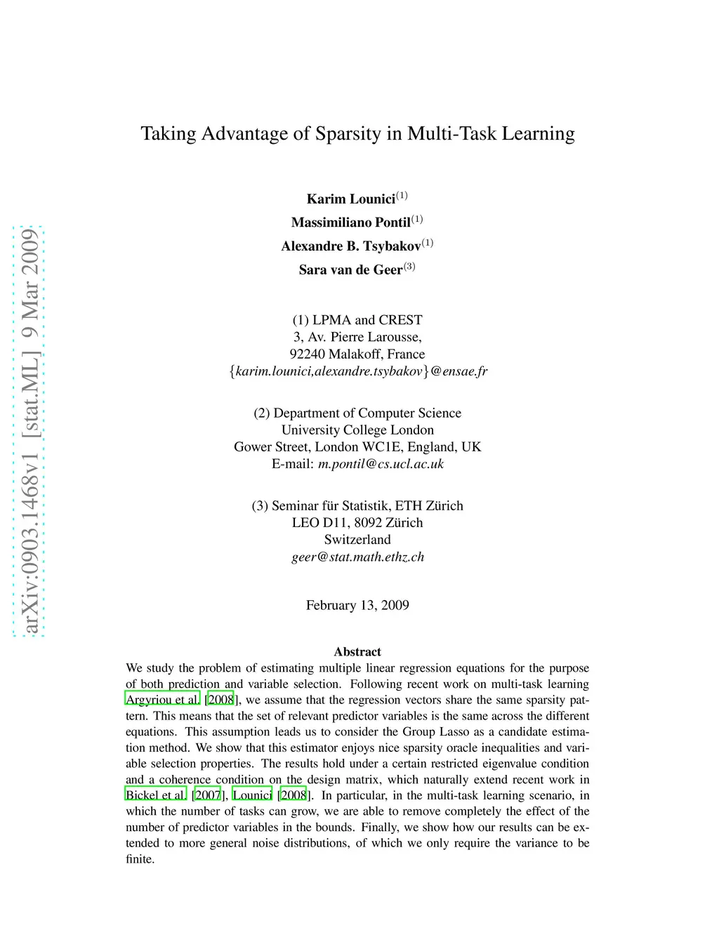 We study the problem of estimating multiple linear regression equations for the purpose of both prediction and variable selection. Following recent work on multi-task learning Argyriou et al. [2008], we assume that the regression vectors share the same sparsity pattern. This means that the set of relevant predictor variables is the same across the different equations. This assumption leads us to consider the Group Lasso as a candidate estimation method. We show that this estimator enjoys nice sparsity oracle inequalities and variable selection properties. The results hold under a certain restricted eigenvalue condition and a coherence condition on the design matrix, which naturally extend recent work in Bickel et al. [2007], Lounici [2008]. In particular, in the multi-task learning scenario, in which the number of tasks can grow, we are able to remove completely the effect of the number of predictor variables in the bounds. Finally, we show how our results can be extended to more general noise distributions, of which we only require the variance to be finite.