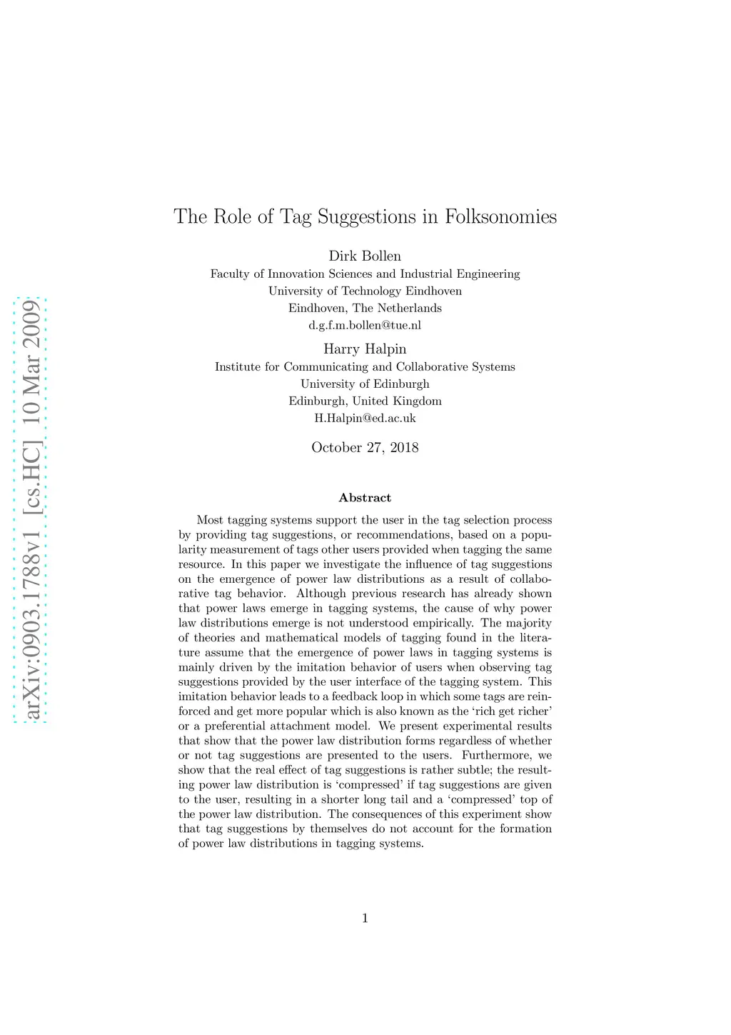 Most tagging systems support the user in the tag selection process by providing tag suggestions, or recommendations, based on a popularity measurement of tags other users provided when tagging the same resource. In this paper we investigate the influence of tag suggestions on the emergence of power law distributions as a result of collaborative tag behavior. Although previous research has already shown that power laws emerge in tagging systems, the cause of why power law distributions emerge is not understood empirically. The majority of theories and mathematical models of tagging found in the literature assume that the emergence of power laws in tagging systems is mainly driven by the imitation behavior of users when observing tag suggestions provided by the user interface of the tagging system. This imitation behavior leads to a feedback loop in which some tags are reinforced and get more popular which is also known as the `rich get richer' or a preferential attachment model. We present experimental results that show that the power law distribution forms regardless of whether or not tag suggestions are presented to the users. Furthermore, we show that the real effect of tag suggestions is rather subtle; the resulting power law distribution is `compressed' if tag suggestions are given to the user, resulting in a shorter long tail and a `compressed' top of the power law distribution. The consequences of this experiment show that tag suggestions by themselves do not account for the formation of power law distributions in tagging systems.