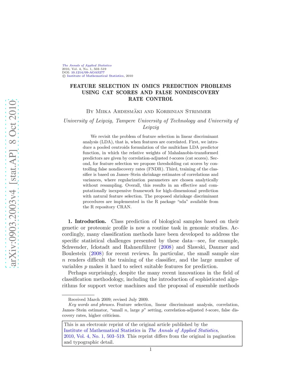 We revisit the problem of feature selection in linear discriminant analysis (LDA), that is, when features are correlated. First, we introduce a pooled centroids formulation of the multiclass LDA predictor function, in which the relative weights of Mahalanobis-transformed predictors are given by correlation-adjusted -scores (cat scores). Second, for feature selection we propose thresholding cat scores by controlling false nondiscovery rates (FNDR). Third, training of the classifier is based on James--Stein shrinkage estimates of correlations and variances, where regularization parameters are chosen analytically without resampling. Overall, this results in an effective and computationally inexpensive framework for high-dimensional prediction with natural feature selection. The proposed shrinkage discriminant procedures are implemented in the R package ``sda'' available from the R repository CRAN.