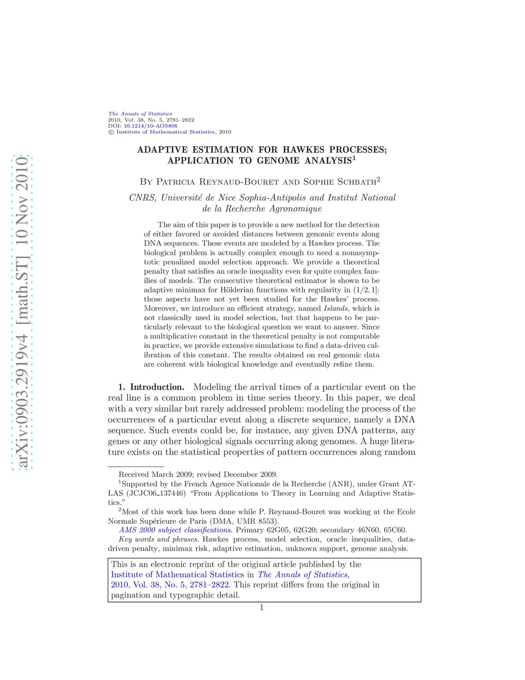 The aim of this paper is to provide a new method for the detection of either favored or avoided distances between genomic events along DNA sequences. These events are modeled by a Hawkes process. The biological problem is actually complex enough to need a nonasymptotic penalized model selection approach. We provide a theoretical penalty that satisfies an oracle inequality even for quite complex families of models. The consecutive theoretical estimator is shown to be adaptive minimax for H\"{o}lderian functions with regularity in : those aspects have not yet been studied for the Hawkes' process. Moreover, we introduce an efficient strategy, named Islands, which is not classically used in model selection, but that happens to be particularly relevant to the biological question we want to answer. Since a multiplicative constant in the theoretical penalty is not computable in practice, we provide extensive simulations to find a data-driven calibration of this constant. The results obtained on real genomic data are coherent with biological knowledge and eventually refine them.