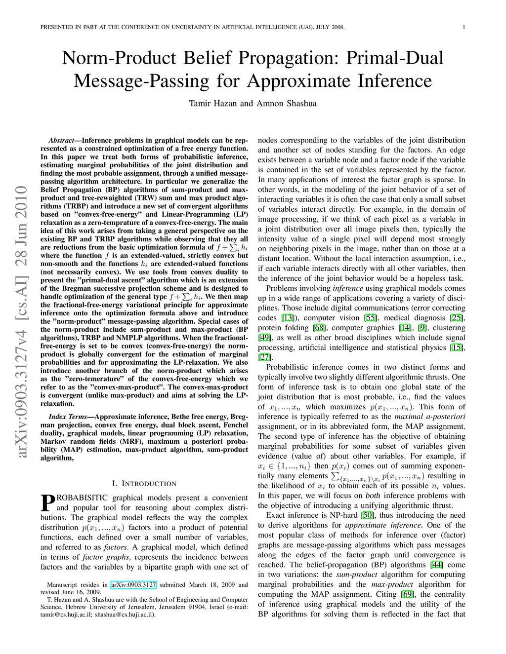 In this paper we treat both forms of probabilistic inference, estimating marginal probabilities of the joint distribution and finding the most probable assignment, through a unified message-passing algorithm architecture. We generalize the Belief Propagation (BP) algorithms of sum-product and max-product and tree-rewaighted (TRW) sum and max product algorithms (TRBP) and introduce a new set of convergent algorithms based on "convex-free-energy" and Linear-Programming (LP) relaxation as a zero-temprature of a convex-free-energy. The main idea of this work arises from taking a general perspective on the existing BP and TRBP algorithms while observing that they all are reductions from the basic optimization formula of where the function is an extended-valued, strictly convex but non-smooth and the functions are extended-valued functions (not necessarily convex). We use tools from convex duality to present the "primal-dual ascent" algorithm which is an extension of the Bregman successive projection scheme and is designed to handle optimization of the general type . Mapping the fractional-free-energy variational principle to this framework introduces the "norm-product" message-passing. Special cases include sum-product and max-product (BP algorithms) and the TRBP algorithms. When the fractional-free-energy is set to be convex (convex-free-energy) the norm-product is globally convergent for estimating of marginal probabilities and for approximating the LP-relaxation. We also introduce another branch of the norm-product, the "convex-max-product". The convex-max-product is convergent (unlike max-product) and aims at solving the LP-relaxation.