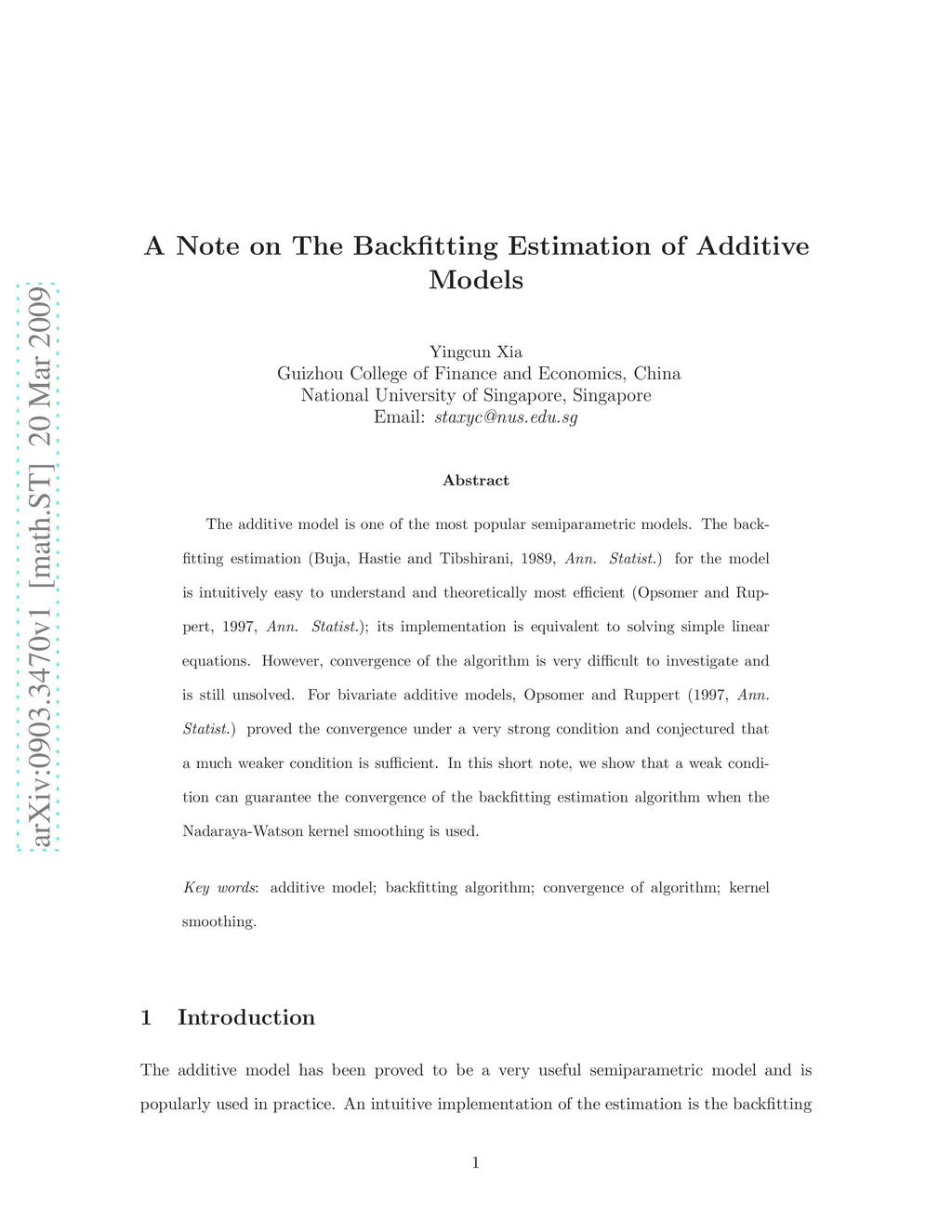 The additive model is one of the most popular semiparametric models. The backfitting estimation (Buja, Hastie and Tibshirani, 1989, \textit{Ann. Statist.}) for the model is intuitively easy to understand and theoretically most efficient (Opsomer and Ruppert, 1997, \textit{Ann. Statist.}); its implementation is equivalent to solving simple linear equations. However, convergence of the algorithm is very difficult to investigate and is still unsolved. For bivariate additive models, Opsomer and Ruppert (1997, \textit{Ann. Statist.}) proved the convergence under a very strong condition and conjectured that a much weaker condition is sufficient. In this short note, we show that a weak condition can guarantee the convergence of the backfitting estimation algorithm when the Nadaraya-Watson kernel smoothing is used.