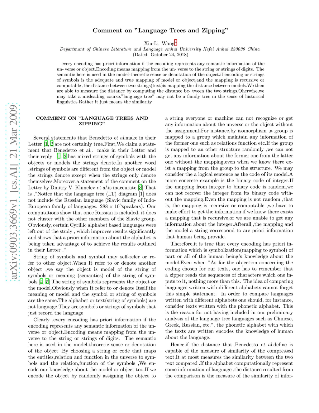 Every encoding has priori information if the encoding represents any semantic information of the unverse or object. Encoding means mapping from the unverse to the string or strings of digits. The semantic here is used in the model-theoretic sense or denotation of the object. If encoding or strings of symbols is the adequate and true mapping of model or object, and the mapping is recursive or computable, the distance between two strings (text) is mapping the distance between models. We then are able to measure the distance by computing the distance between the two strings. Otherwise, we may take a misleading course. "Language tree" may not be a family tree in the sense of historical linguistics. Rather it just means the similarity.