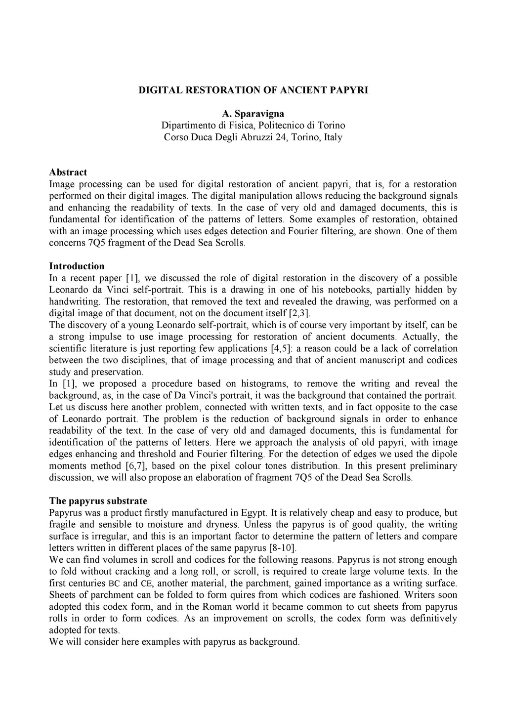 Image processing can be used for digital restoration of ancient papyri, that is, for a restoration performed on their digital images. The digital manipulation allows reducing the background signals and enhancing the readability of texts. In the case of very old and damaged documents, this is fundamental for identification of the patterns of letters. Some examples of restoration, obtained with an image processing which uses edges detection and Fourier filtering, are shown. One of them concerns 7Q5 fragment of the Dead Sea Scrolls.