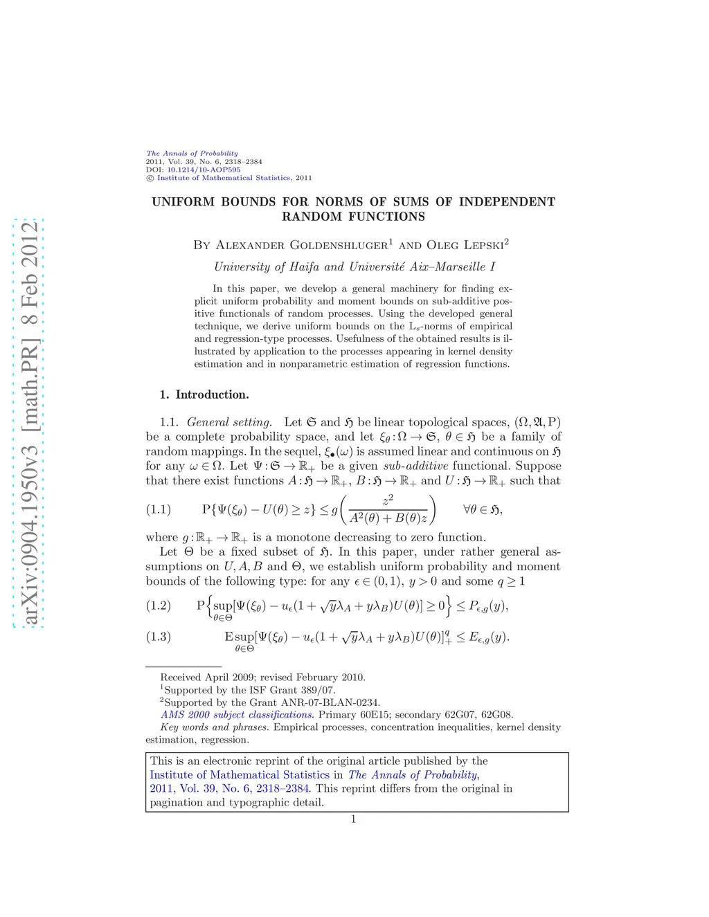 In this paper, we develop a general machinery for finding explicit uniform probability and moment bounds on sub-additive positive functionals of random processes. Using the developed general technique, we derive uniform bounds on the -norms of empirical and regression-type processes. Usefulness of the obtained results is illustrated by application to the processes appearing in kernel density estimation and in nonparametric estimation of regression functions.