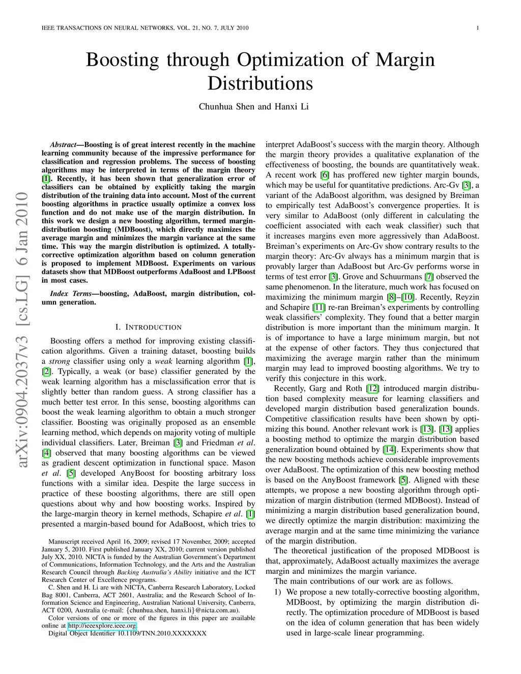 Boosting has attracted much research attention in the past decade. The success of boosting algorithms may be interpreted in terms of the margin theory. Recently it has been shown that generalization error of classifiers can be obtained by explicitly taking the margin distribution of the training data into account. Most of the current boosting algorithms in practice usually optimizes a convex loss function and do not make use of the margin distribution. In this work we design a new boosting algorithm, termed margin-distribution boosting (MDBoost), which directly maximizes the average margin and minimizes the margin variance simultaneously. This way the margin distribution is optimized. A totally-corrective optimization algorithm based on column generation is proposed to implement MDBoost. Experiments on UCI datasets show that MDBoost outperforms AdaBoost and LPBoost in most cases.