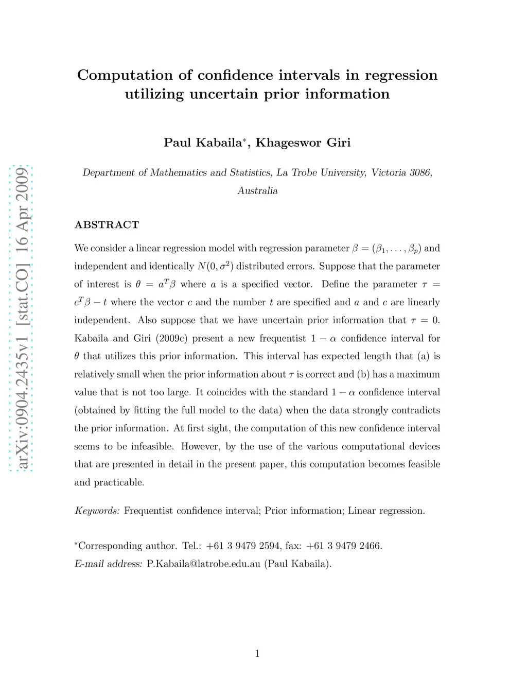 We consider a linear regression model with regression parameter beta =(beta_1, ..., beta_p) and independent and identically N(0, sigma^2)distributed errors. Suppose that the parameter of interest is theta = a^T beta where a is a specified vector. Define the parameter tau = c^T beta - t where the vector c and the number t are specified and a and c are linearly independent. Also suppose that we have uncertain prior information that tau = 0. Kabaila and Giri (2009c) present a new frequentist 1-alpha confidence interval for theta that utilizes this prior information. This interval has expected length that (a) is relatively small when the prior information about tau is correct and (b) has a maximum value that is not too large. It coincides with the standard 1-alpha confidence interval (obtained by fitting the full model to the data) when the data strongly contradicts the prior information. At first sight, the computation of this new confidence interval seems to be infeasible. However, by the use of the various computational devices that are presented in detail in the present paper, this computation becomes feasible and practicable.