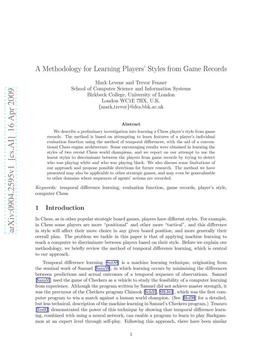 We describe a preliminary investigation into learning a Chess player's style from game records. The method is based on attempting to learn features of a player's individual evaluation function using the method of temporal differences, with the aid of a conventional Chess engine architecture. Some encouraging results were obtained in learning the styles of two recent Chess world champions, and we report on our attempt to use the learnt styles to discriminate between the players from game records by trying to detect who was playing white and who was playing black. We also discuss some limitations of our approach and propose possible directions for future research. The method we have presented may also be applicable to other strategic games, and may even be generalisable to other domains where sequences of agents' actions are recorded.