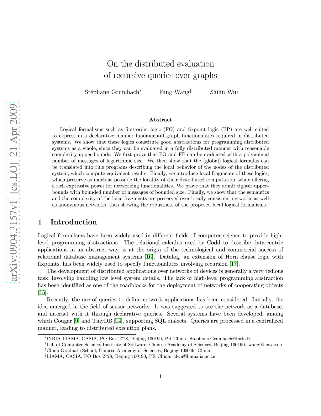 Logical formalisms such as first-order logic (FO) and fixpoint logic (FP) are well suited to express in a declarative manner fundamental graph functionalities required in distributed systems. We show that these logics constitute good abstractions for programming distributed systems as a whole, since they can be evaluated in a fully distributed manner with reasonable complexity upper-bounds. We first prove that FO and FP can be evaluated with a polynomial number of messages of logarithmic size. We then show that the (global) logical formulas can be translated into rule programs describing the local behavior of the nodes of the distributed system, which compute equivalent results. Finally, we introduce local fragments of these logics, which preserve as much as possible the locality of their distributed computation, while offering a rich expressive power for networking functionalities. We prove that they admit tighter upper-bounds with bounded number of messages of bounded size. Finally, we show that the semantics and the complexity of the local fragments are preserved over locally consistent networks as well as anonymous networks, thus showing the robustness of the proposed local logical formalisms.