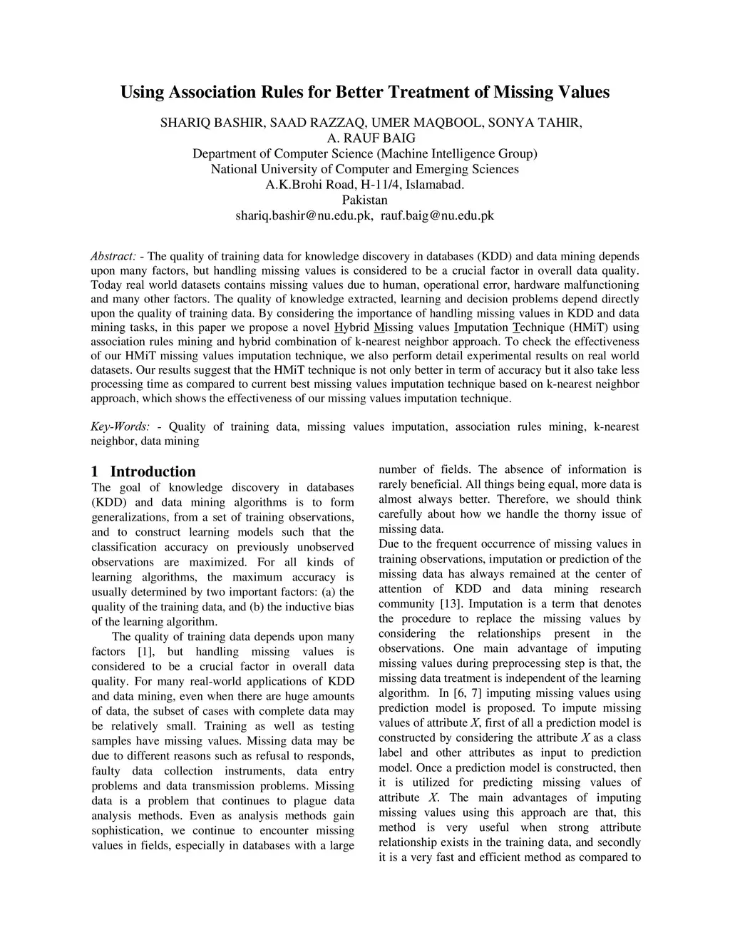 The quality of training data for knowledge discovery in databases (KDD) and data mining depends upon many factors, but handling missing values is considered to be a crucial factor in overall data quality. Today real world datasets contains missing values due to human, operational error, hardware malfunctioning and many other factors. The quality of knowledge extracted, learning and decision problems depend directly upon the quality of training data. By considering the importance of handling missing values in KDD and data mining tasks, in this paper we propose a novel Hybrid Missing values Imputation Technique (HMiT) using association rules mining and hybrid combination of k-nearest neighbor approach. To check the effectiveness of our HMiT missing values imputation technique, we also perform detail experimental results on real world datasets. Our results suggest that the HMiT technique is not only better in term of accuracy but it also take less processing time as compared to current best missing values imputation technique based on k-nearest neighbor approach, which shows the effectiveness of our missing values imputation technique.