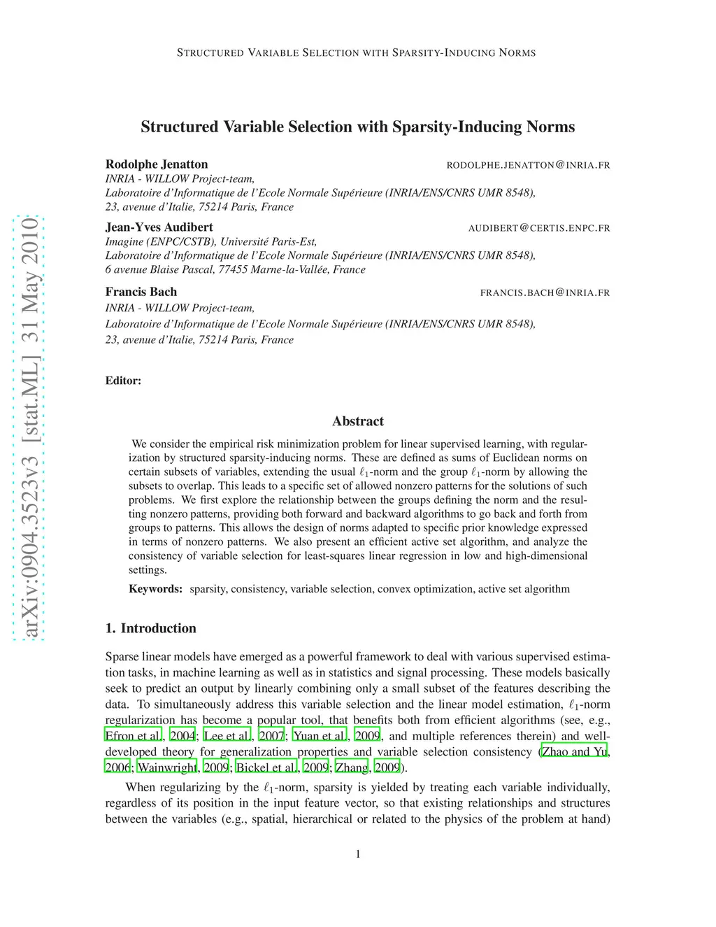 We consider the empirical risk minimization problem for linear supervised learning, with regularization by structured sparsity-inducing norms. These are defined as sums of Euclidean norms on certain subsets of variables, extending the usual -norm and the group -norm by allowing the subsets to overlap. This leads to a specific set of allowed nonzero patterns for the solutions of such problems. We first explore the relationship between the groups defining the norm and the resulting nonzero patterns, providing both forward and backward algorithms to go back and forth from groups to patterns. This allows the design of norms adapted to specific prior knowledge expressed in terms of nonzero patterns. We also present an efficient active set algorithm, and analyze the consistency of variable selection for least-squares linear regression in low and high-dimensional settings.