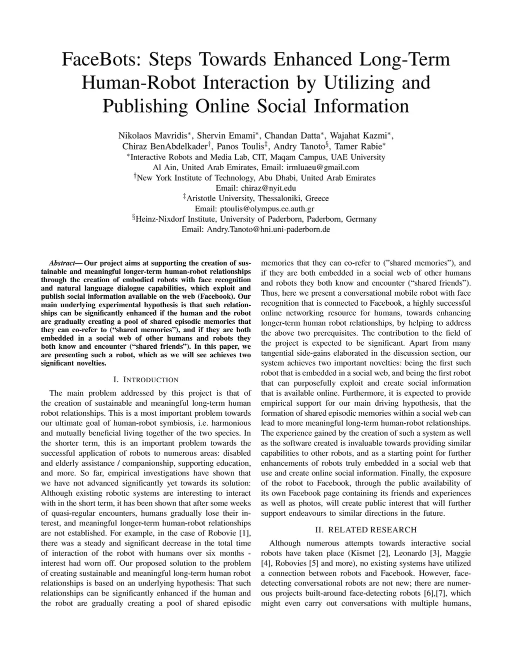 Our project aims at supporting the creation of sustainable and meaningful longer-term human-robot relationships through the creation of embodied robots with face recognition and natural language dialogue capabilities, which exploit and publish social information available on the web (Facebook). Our main underlying experimental hypothesis is that such relationships can be significantly enhanced if the human and the robot are gradually creating a pool of shared episodic memories that they can co-refer to (shared memories), and if they are both embedded in a social web of other humans and robots they both know and encounter (shared friends). In this paper, we are presenting such a robot, which as we will see achieves two significant novelties.