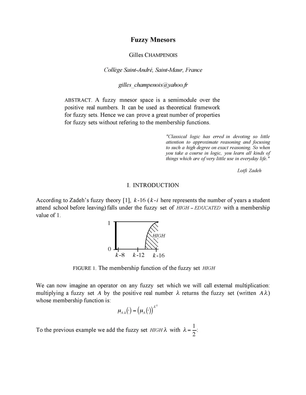 A fuzzy mnesor space is a semimodule over the positive real numbers. It can be used as theoretical framework for fuzzy sets. Hence we can prove a great number of properties for fuzzy sets without refering to the membership functions.