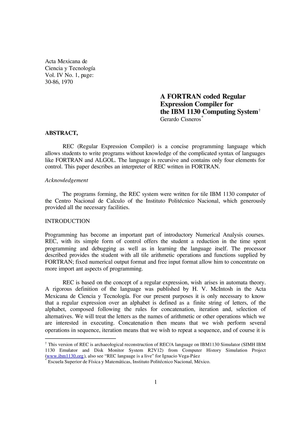 A FORTRAN coded regular expression Compiler for IBM 1130 Computing