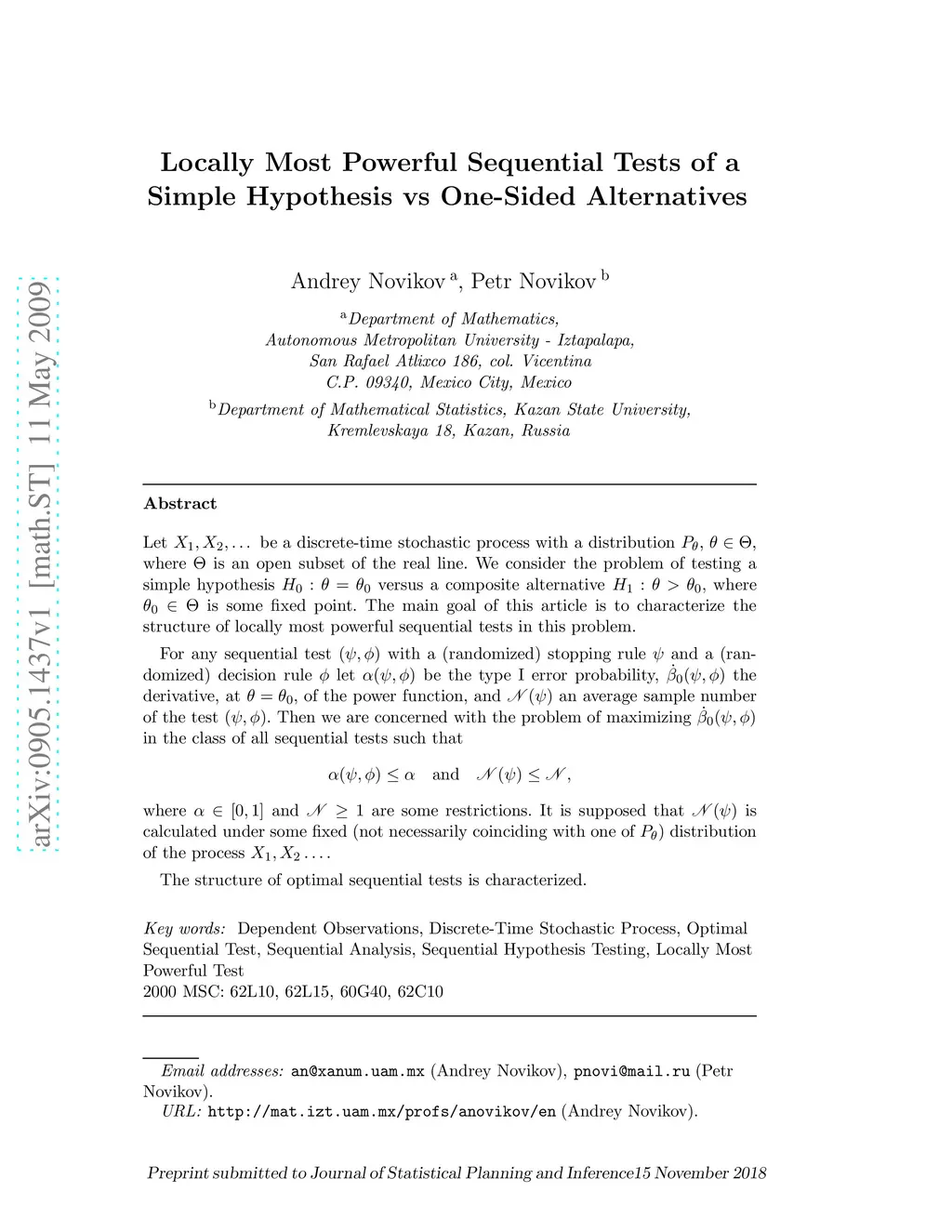 Let be a discrete-time stochastic process with a distribution , , where is an open subset of the real line. We consider the problem of testing a simple hypothesis versus a composite alternative , where is some fixed point. The main goal of this article is to characterize the structure of locally most powerful sequential tests in this problem. For any sequential test with a (randomized) stopping rule and a (randomized) decision rule let be the type I error probability, the derivative, at , of the power function, and an average sample number of the test . Then we are concerned with the problem of maximizing in the class of all sequential tests such that where and are some restrictions. It is supposed that is calculated under some fixed (not necessarily coinciding with one of ) distribution of the process . The structure of optimal sequential tests is characterized.