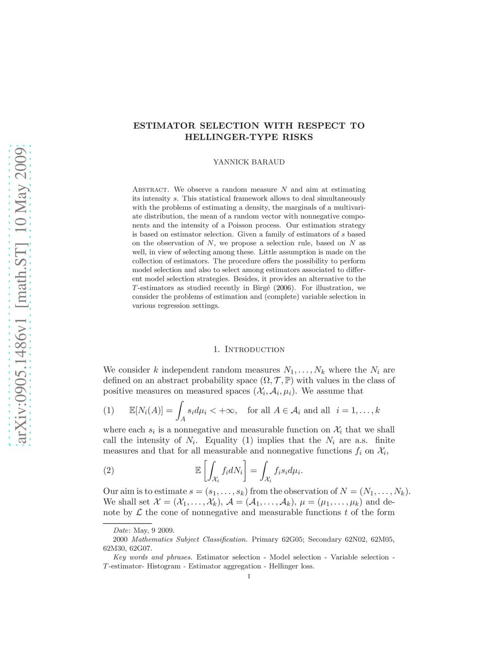We observe a random measure and aim at estimating its intensity . This statistical framework allows to deal simultaneously with the problems of estimating a density, the marginals of a multivariate distribution, the mean of a random vector with nonnegative components and the intensity of a Poisson process. Our estimation strategy is based on estimator selection. Given a family of estimators of based on the observation of , we propose a selection rule, based on as well, in view of selecting among these. Little assumption is made on the collection of estimators. The procedure offers the possibility to perform model selection and also to select among estimators associated to different model selection strategies. Besides, it provides an alternative to the -estimators as studied recently in Birg\é (2006). For illustration, we consider the problems of estimation and (complete) variable selection in various regression settings.