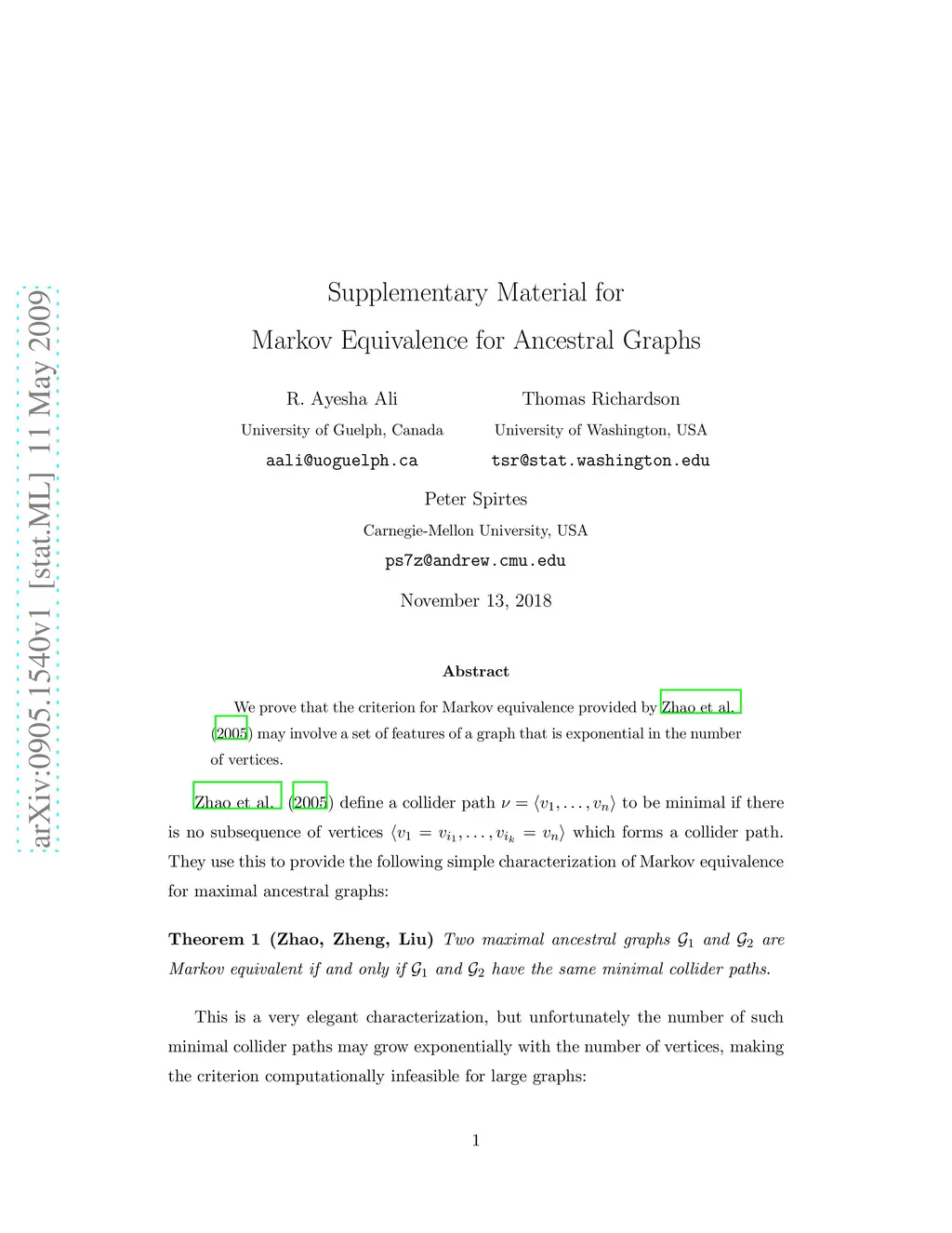 We prove that the criterion for Markov equivalence provided by Zhao et al. (2005) may involve a set of features of a graph that is exponential in the number of vertices.