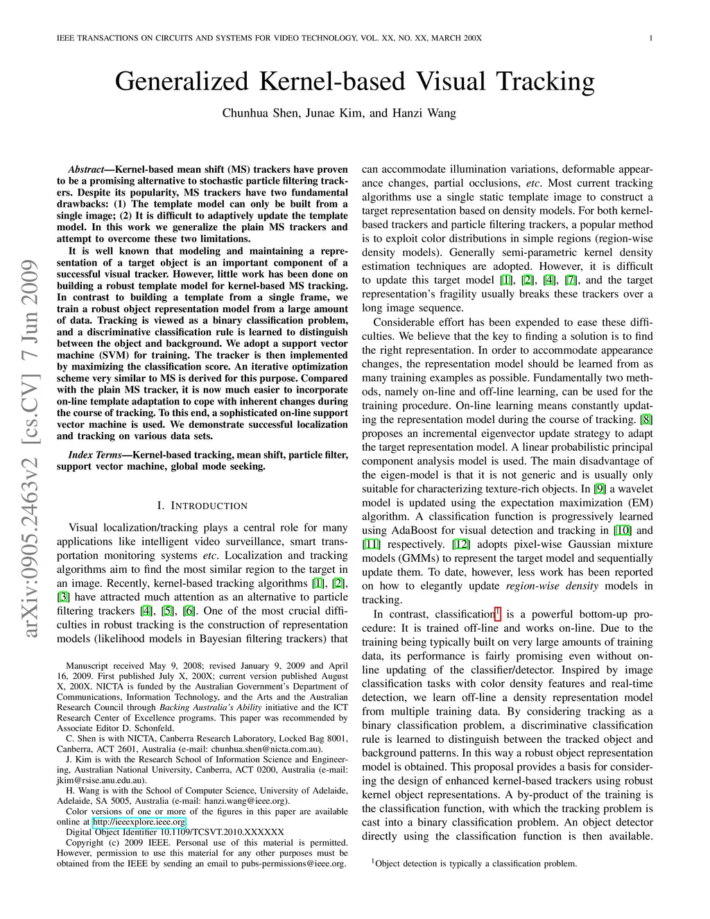 In this work we generalize the plain MS trackers and attempt to overcome standard mean shift trackers' two limitations. It is well known that modeling and maintaining a representation of a target object is an important component of a successful visual tracker. However, little work has been done on building a robust template model for kernel-based MS tracking. In contrast to building a template from a single frame, we train a robust object representation model from a large amount of data. Tracking is viewed as a binary classification problem, and a discriminative classification rule is learned to distinguish between the object and background. We adopt a support vector machine (SVM) for training. The tracker is then implemented by maximizing the classification score. An iterative optimization scheme very similar to MS is derived for this purpose.