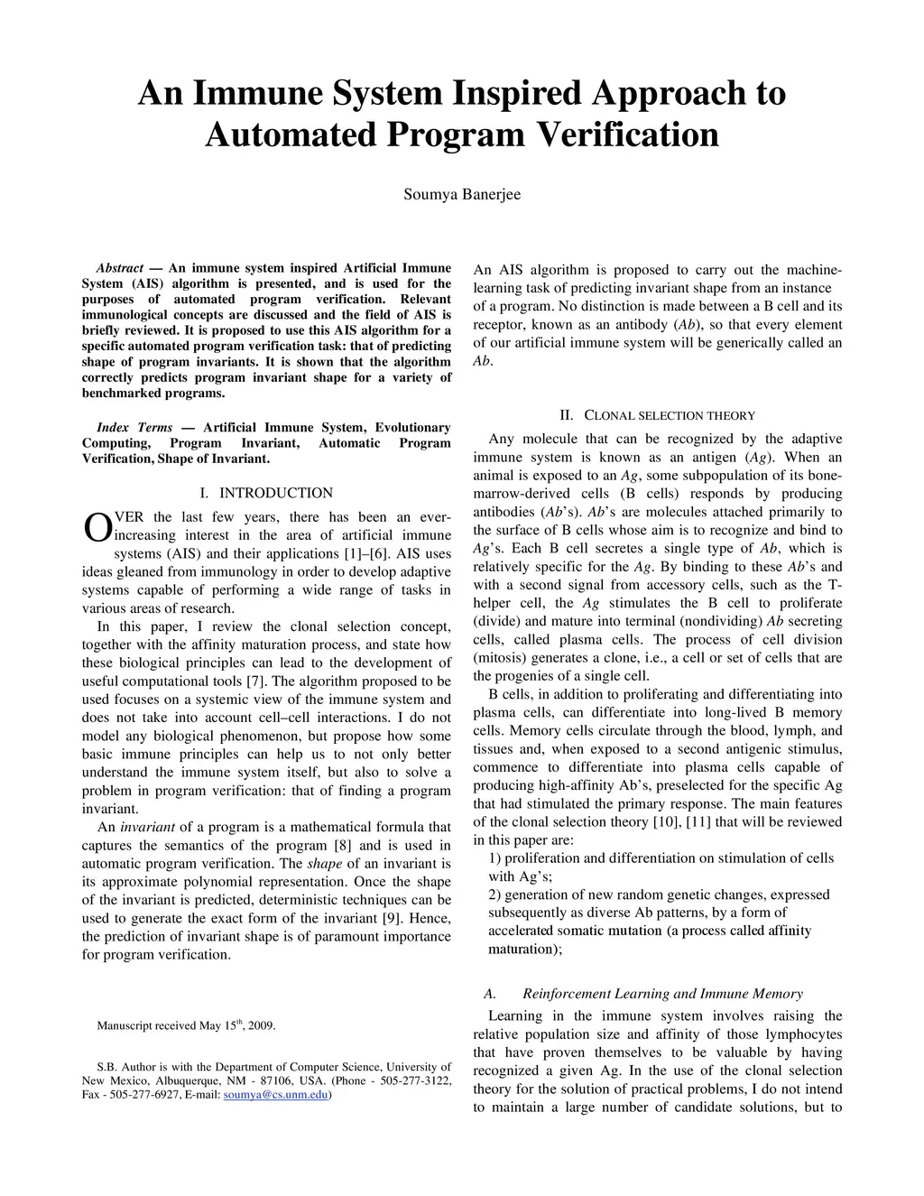 An immune system inspired Artificial Immune System (AIS) algorithm is presented, and is used for the purposes of automated program verification. Relevant immunological concepts are discussed and the field of AIS is briefly reviewed. It is proposed to use this AIS algorithm for a specific automated program verification task: that of predicting shape of program invariants. It is shown that the algorithm correctly predicts program invariant shape for a variety of benchmarked programs.