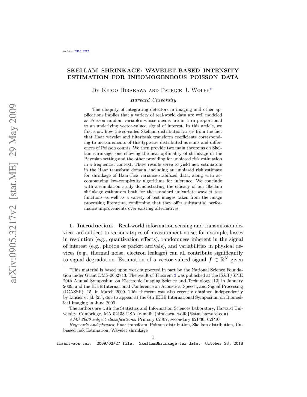 The ubiquity of integrating detectors in imaging and other applications implies that a variety of real-world data are well modeled as Poisson random variables whose means are in turn proportional to an underlying vector-valued signal of interest. In this article, we first show how the so-called Skellam distribution arises from the fact that Haar wavelet and filterbank transform coefficients corresponding to measurements of this type are distributed as sums and differences of Poisson counts. We then provide two main theorems on Skellam shrinkage, one showing the near-optimality of shrinkage in the Bayesian setting and the other providing for unbiased risk estimation in a frequentist context. These results serve to yield new estimators in the Haar transform domain, including an unbiased risk estimate for shrinkage of Haar-Fisz variance-stabilized data, along with accompanying low-complexity algorithms for inference. We conclude with a simulation study demonstrating the efficacy of our Skellam shrinkage estimators both for the standard univariate wavelet test functions as well as a variety of test images taken from the image processing literature, confirming that they offer substantial performance improvements over existing alternatives.