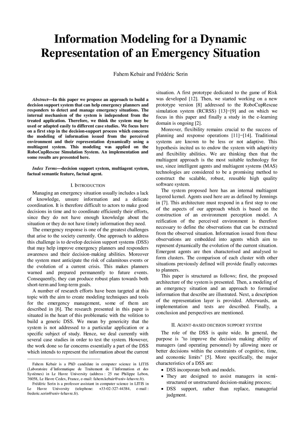 In this paper we propose an approach to build a decision support system that can help emergency planners and responders to detect and manage emergency situations. The internal mechanism of the system is independent from the treated application. Therefore, we think the system may be used or adapted easily to different case studies. We focus here on a first step in the decision-support process which concerns the modeling of information issued from the perceived environment and their representation dynamically using a multiagent system. This modeling was applied on the RoboCupRescue Simulation System. An implementation and some results are presented here.